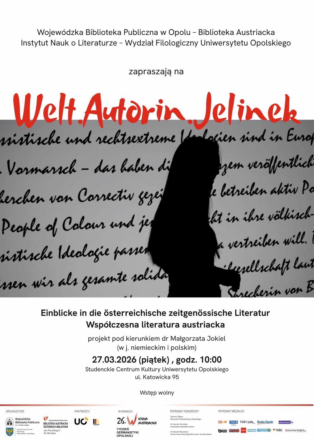 Zapraszamy 27.03.2026 (piątek) o godz. 10.00 do Studenckiego Centrum Kultury UO na spotkanie pt. "Welt.Autorin.Jelinek - Einblicke in die österreichische zeitgenössische Literatur – współczesna literatura austriacka". Projekt pod kierunkiem dr Małgorzaty Jokiel (w języku niemieckim i polskim).